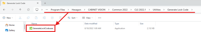 In the File Explorer, navigate to GenerateLockCode.exe. You will find it in a File location similar to "C:\Program Files\Hexagon\CABINET VISION\Common 2022\CLS 2022.1\Utilities\Generate Lock Code\GenerateLockCode.exe" Run this program.