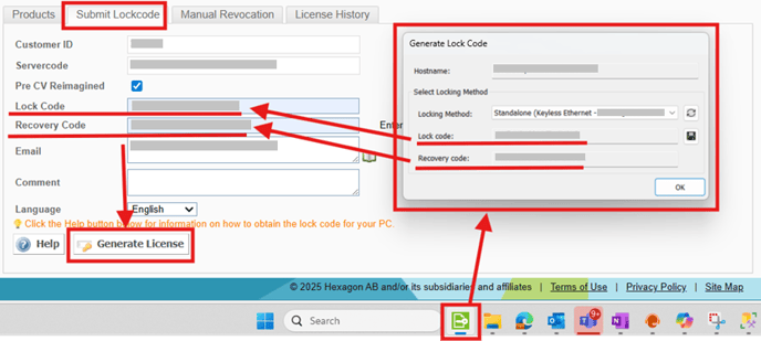 Select the Submit Lockcode tab, Open the Generate Lock Code window, Copy the "Lock Code" and "Recovery Code" from the "Generate Lock Code" window to the "Hexagon Portal - Submit Lockcode" fields. When the details are entered correctly click Generate Licence