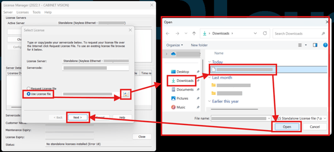 Select Use Licence File, Click the Open Folder Icon, find the "<#servercode>.clss" file in the Downloads folder and select Open, then click Next >