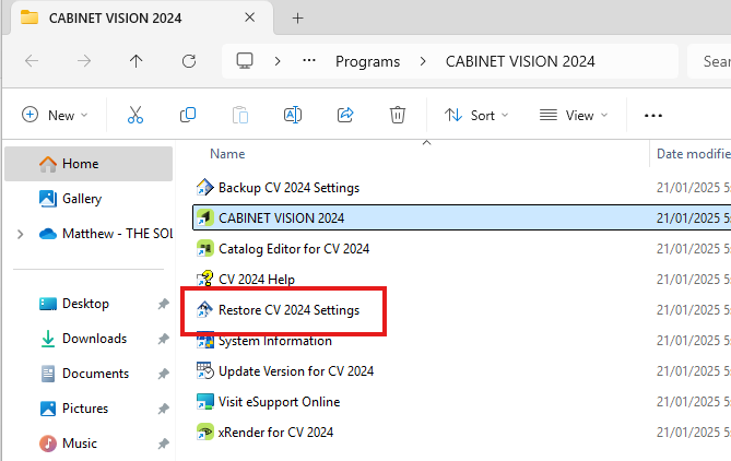 Run the Restore feature. In the folder CABINET VISION > CV 2024 you will find application CVRestore.exe. Double click to run