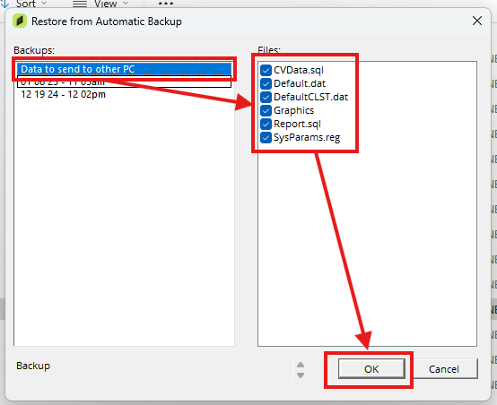 The Restore from Automatic Backup will allow you to select any Backup folder saved in the Automatic Backups folder. Select the one you want to restore, check the boxes of the files you want to restore and click ok