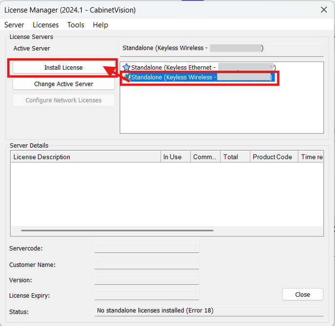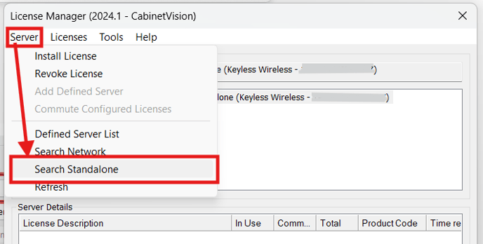 If you would like to Install a License other than one already visible, click on Server in the top left, and then select Search Standalone from the drop down menu